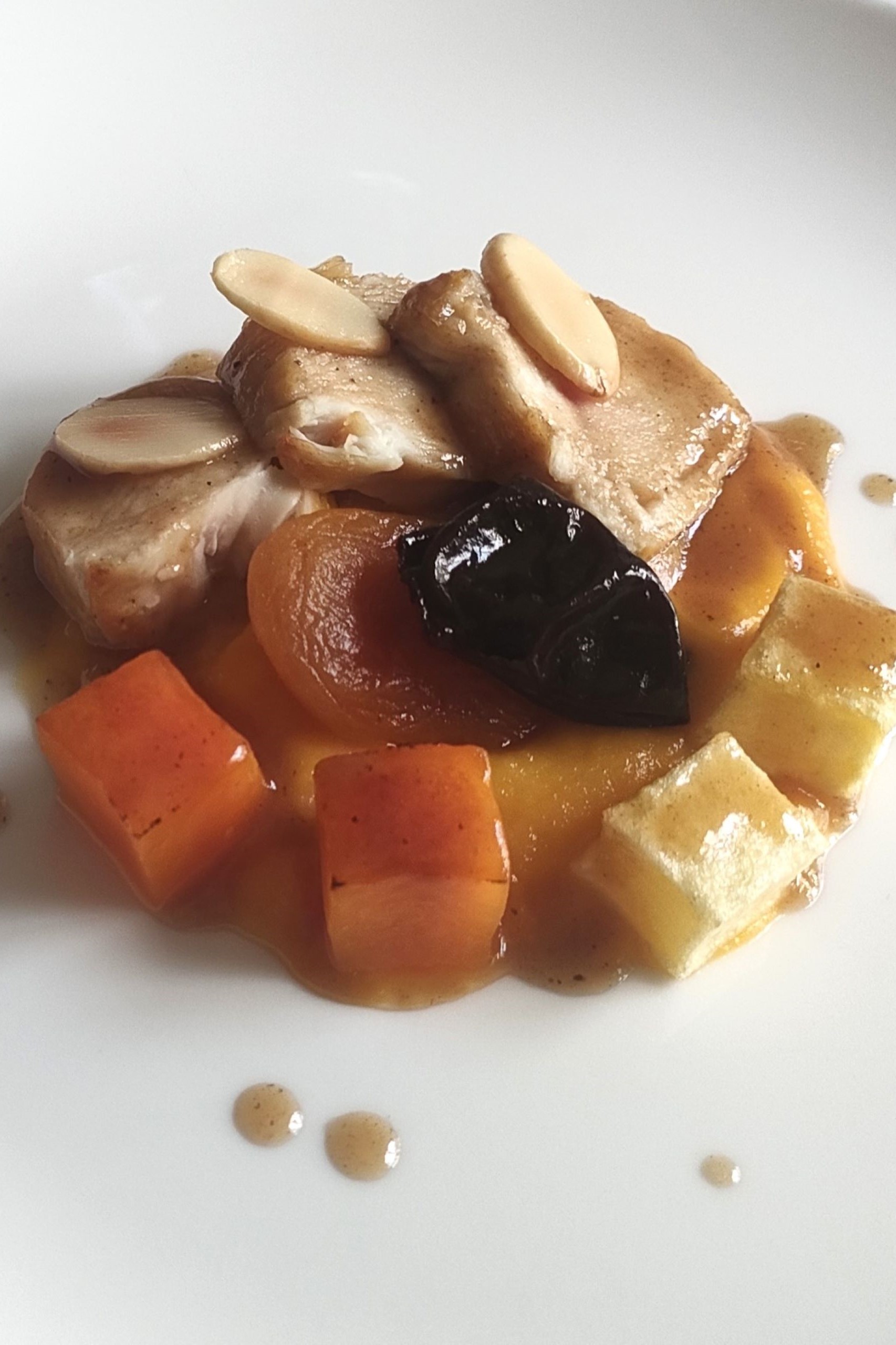 Una exquisita lubina cocida en una suave salsa de tomate, aceitunas y hierbas mediterráneas. El pescado, fresco y de carne blanca, se deshace suavemente en la boca, ofreciendo un equilibrio perfecto entre los sabores del mar y los aromas del Mediterráneo.